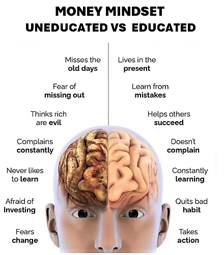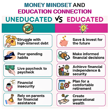 EDUCATION....Lays The Foundation For Money Mindset. All that you know about money began on your first day of school. You were never taught any lessons about money to prepare you in becoming financially literate. The reason behind lack of education about money established a society of generation to generation financial struggle.